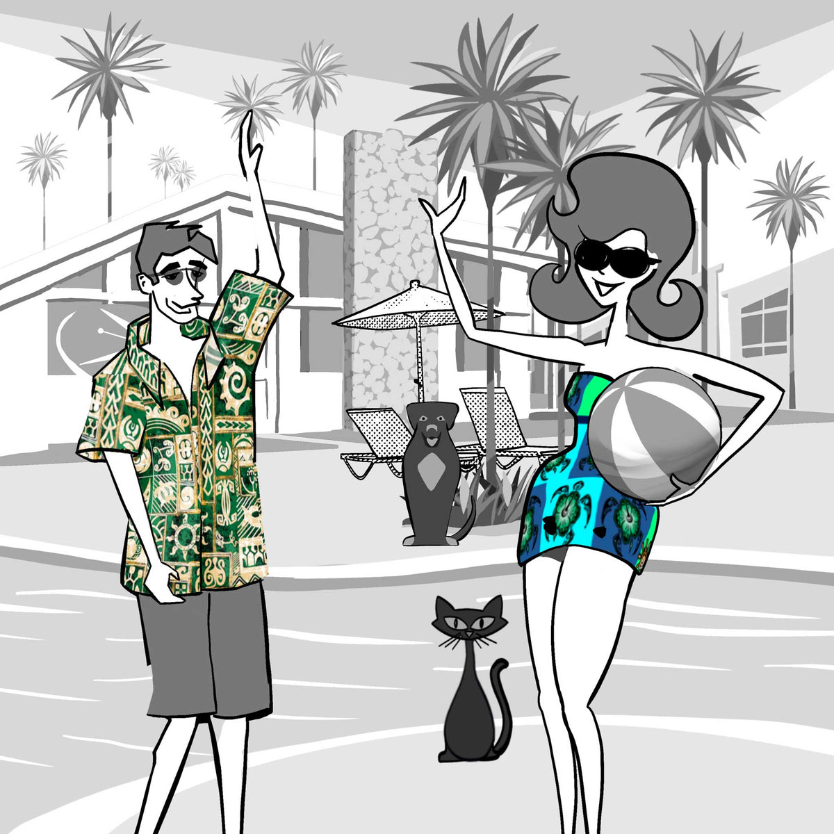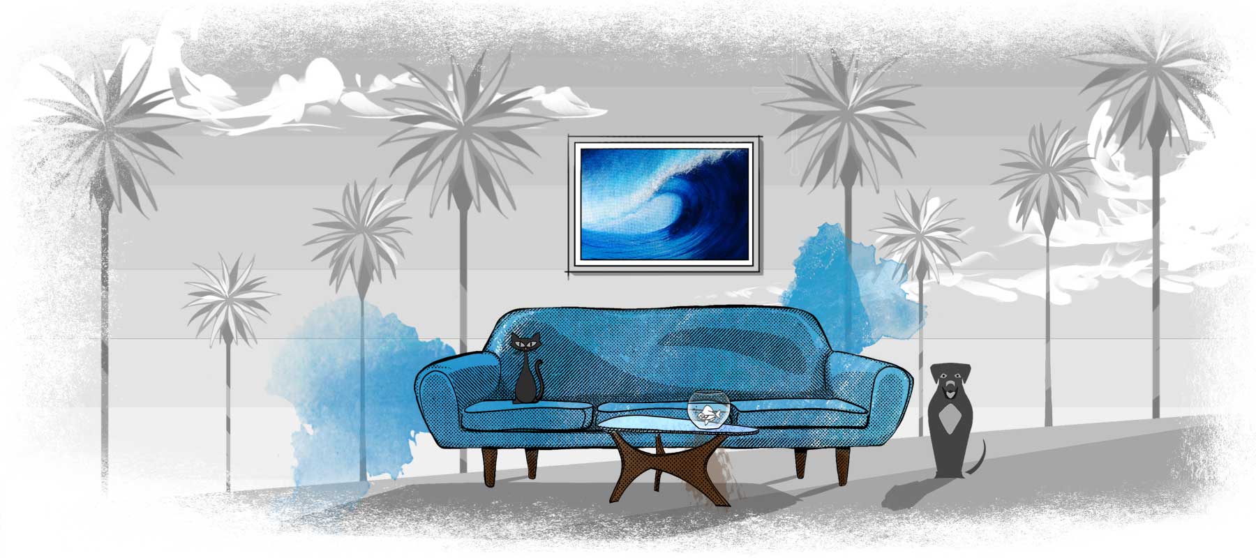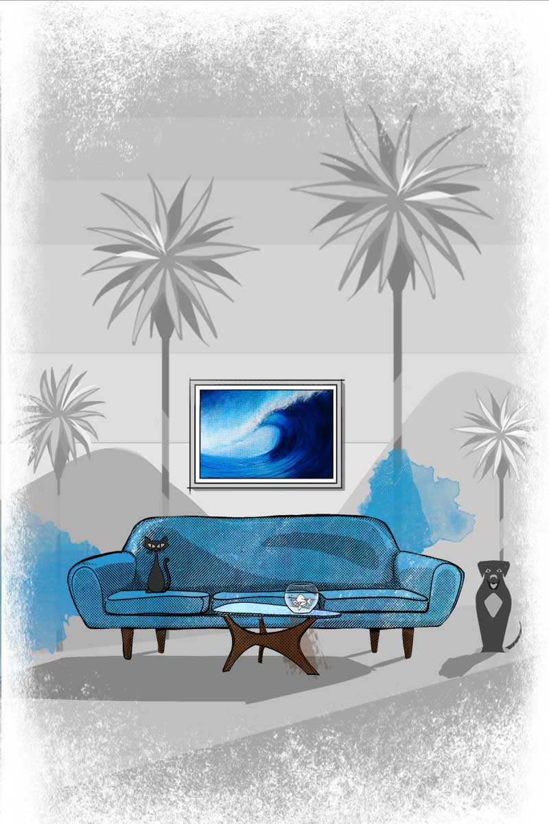New original coastal art collection from 5th & Rugged — colorful seascapes and mid-century modern paintings displayed together in a Palm Springs-inspired room.