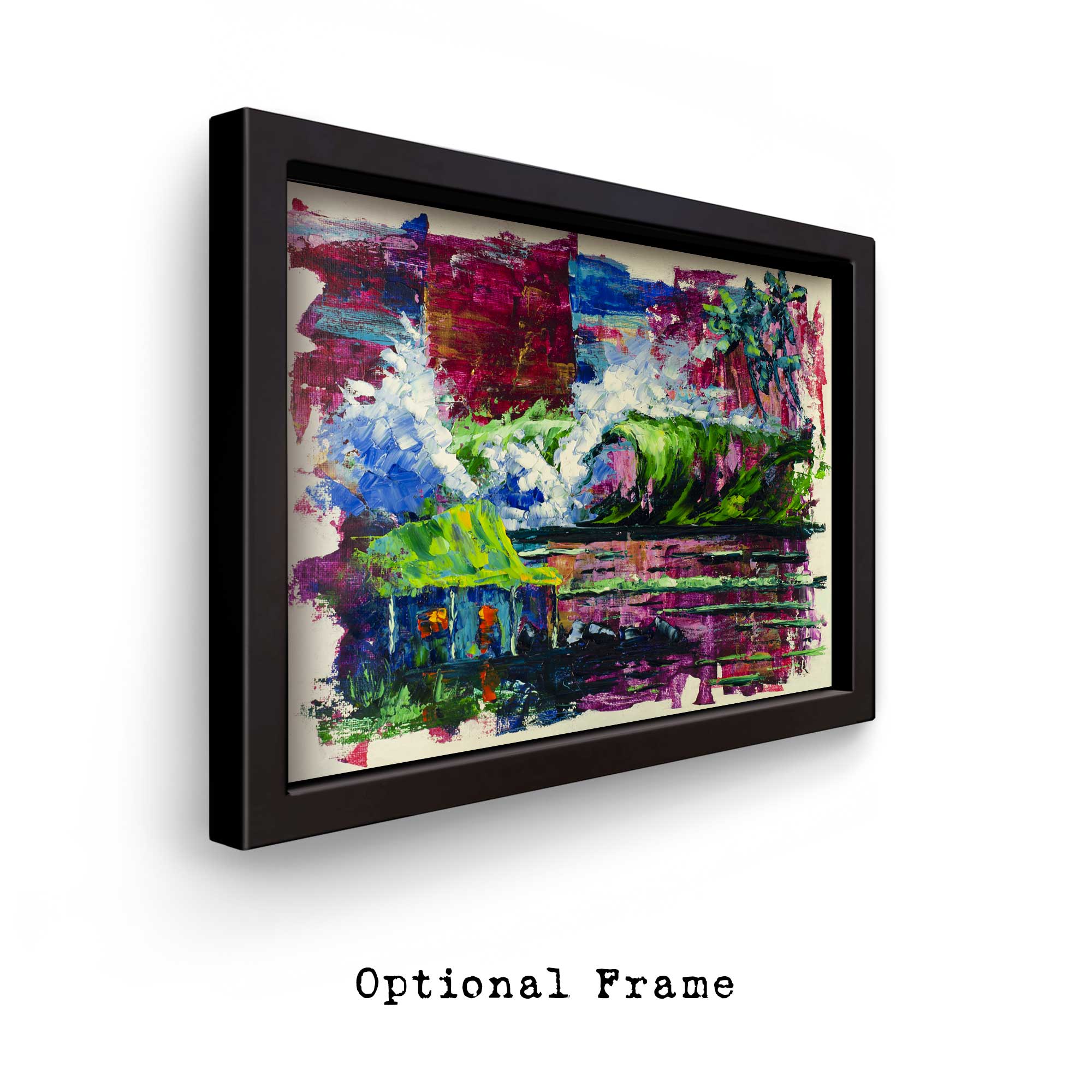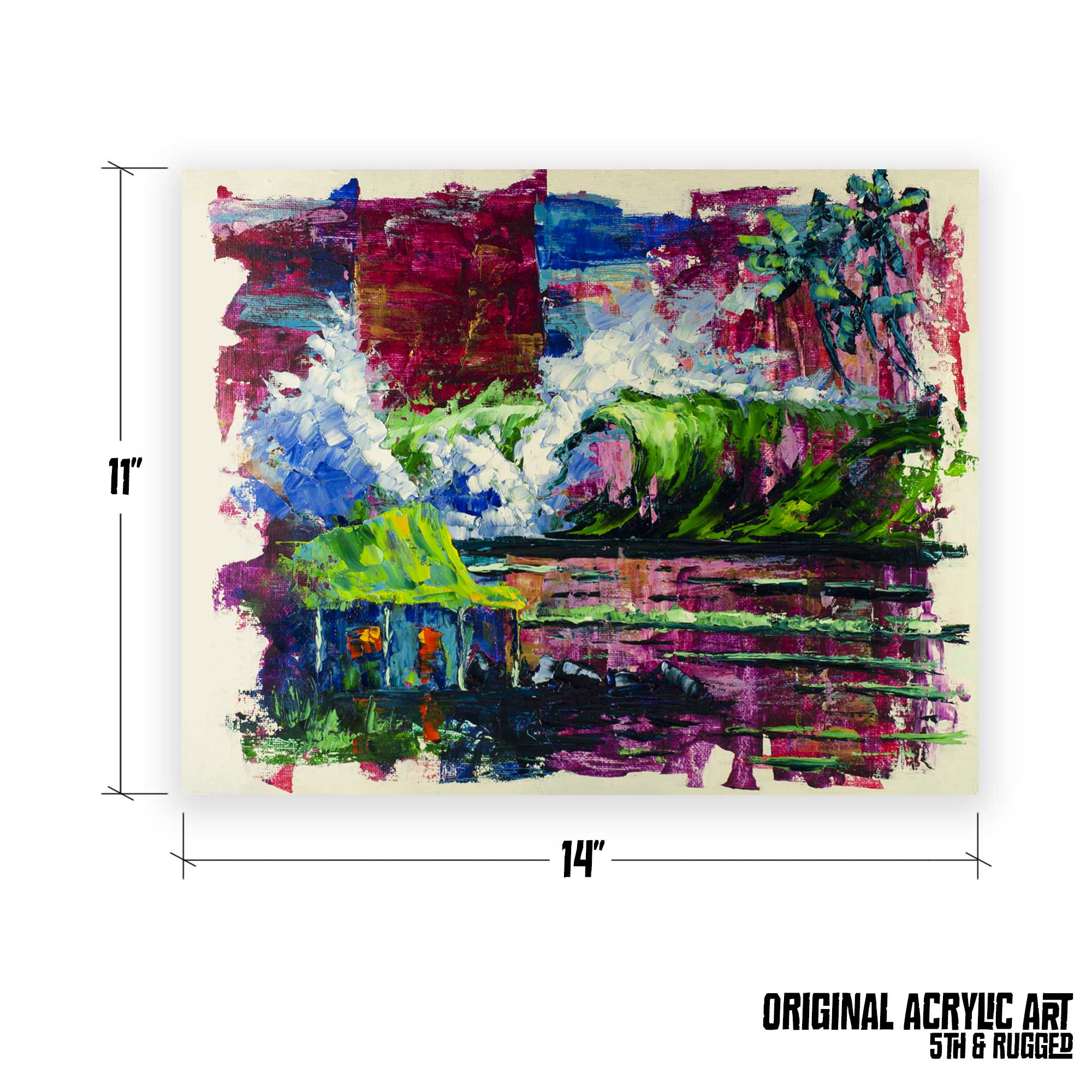 Lagoon Dreams is a love letter to that moment—the one where color and motion meet memory. The abstract base gives way to a small, bright hut watching the tide roll in, equal parts shelter and daydream. Layers of bold acrylic brushwork capture the ocean’s energy, while the resin finish seals it all in a glassy calm.