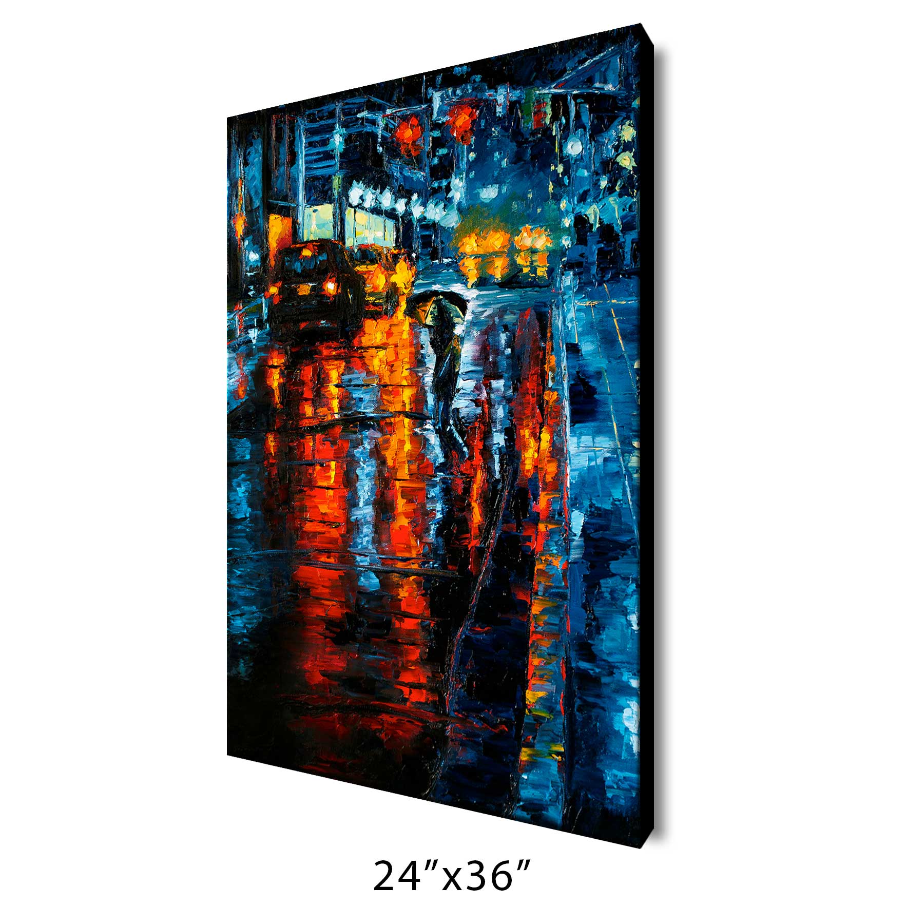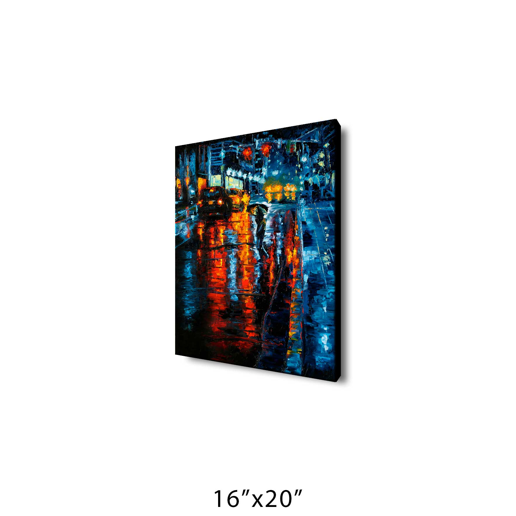 The city streets come alive at night in this mesmerizing city art print by artist Nelson Ruger. Capturing the ethereal light after a rain, the colors dance and reflect off the puddles and pavement in a truly stunning display. The original oil painting was created with thick layers of paint straight from the tube, giving it an incredible depth and vibrancy. And with UV-proof inks, you can be sure that your print will never fade. Hang it in your living room or bedroom for a touch of urban sophistication that is sure to impress.