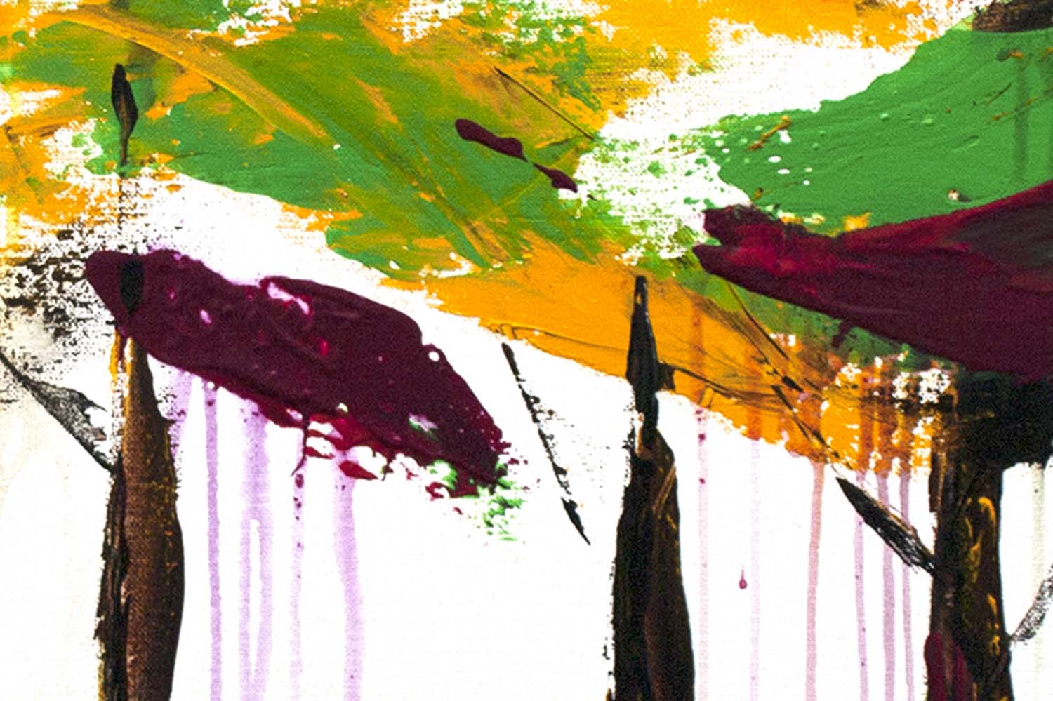 By using only bold sweeps of a palette knife and a restricted palette of red, gold, green, and brown, Ruger creates an abstract landscape that brings out immense emotion. He then takes this piece up several notches by adding a water bottle spray in select places. The result is art that looks like nature itself decided to sprinkle water on its canvas - spattering it with color and making every stroke dance.