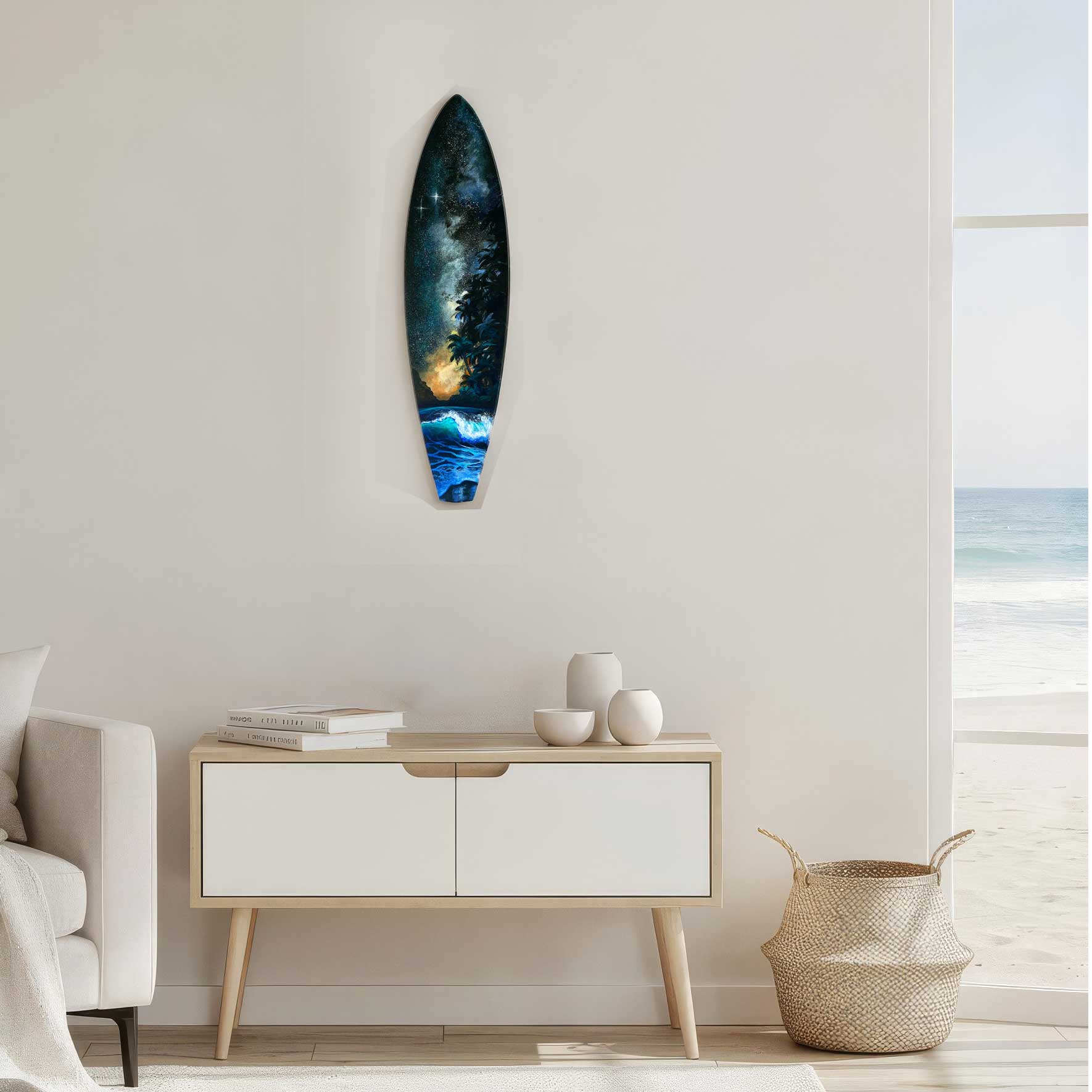 Painted on a handcrafted hardwood surfboard and finished with a glossy resin coat, the piece blends coastal warmth with a subtle celestial mood. Whether displayed in an entryway, bedroom, or coastal gallery wall, Starshine brings a sense of calm, wonder, and escape — a small portal to the shore after dark.