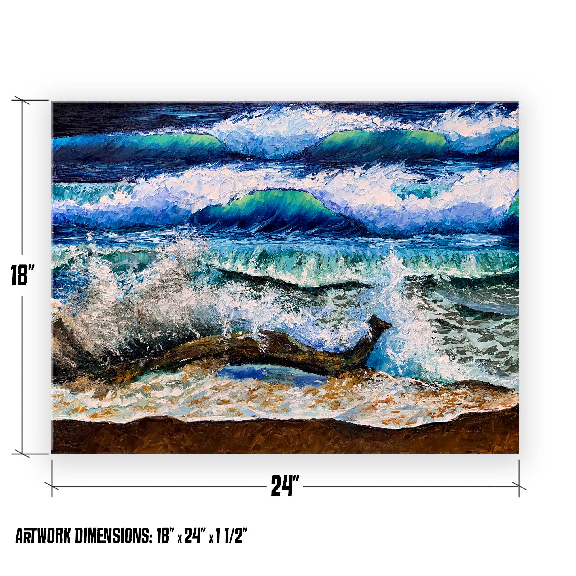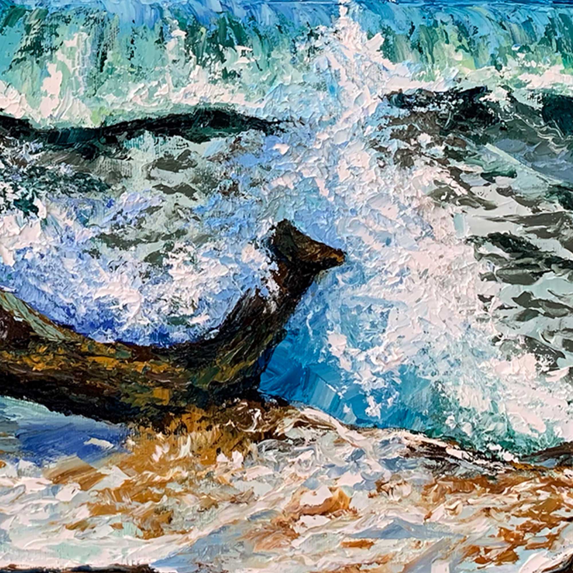 A powerful wave collapses against sun-washed driftwood on Kauai’s Lava Lava Beach, captured in deep texture and shimmering color. Painted entirely with a palette knife, Where You’ll Always Find Me brings the thunder, sparkle, and rhythm of the ocean into your space — the kind of place your soul wanders back to again and again.